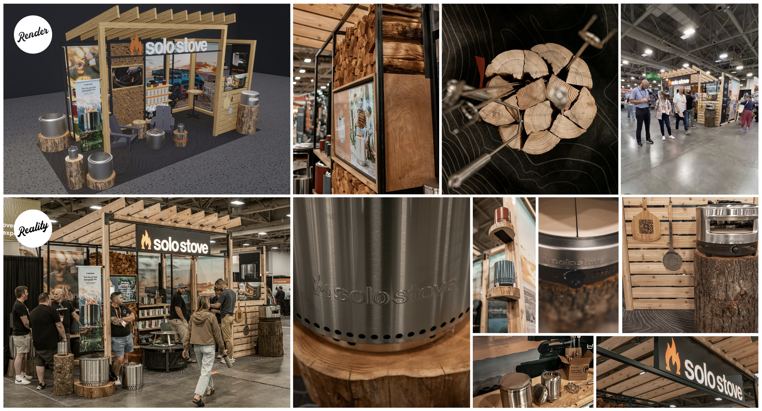 Blending the unrefined, natural elements of a great adventure with the pleasing structure of a great backyard pergola, the new trade show booth created an inviting meeting place to communicate the Solo Stove brand.